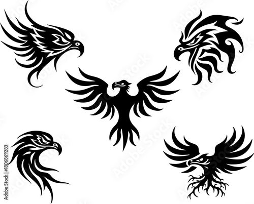 © Vector market, Obraz premium Tribal Eagle Silhouette Bundle – Fierce Bird Head & Winged Eagle Vector Set