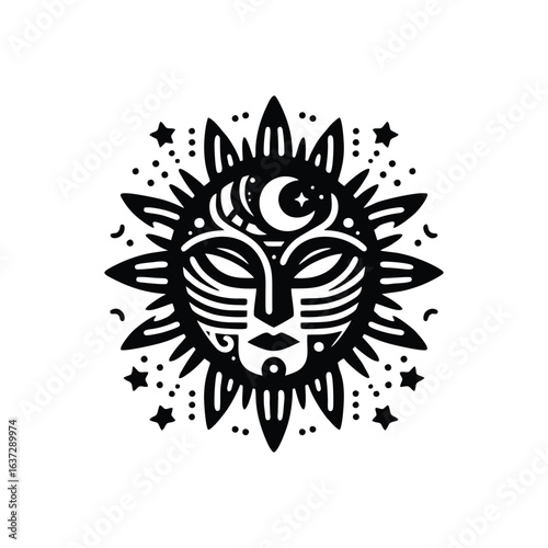 Fototapeta premium Tribal masks representing night, crescent moon and stars are integrated