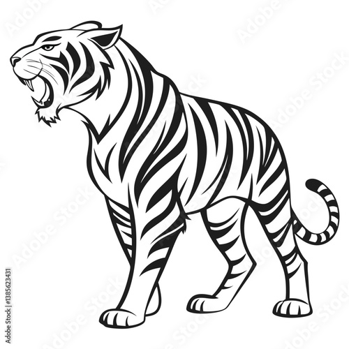 Naklejka premium tribal tiger, geometric pattern, black and white illustration, stylized animal art, roaring feline, bold lines, diamond shapes, symmetrical design, monochrome, abstract big cat, native art influence,