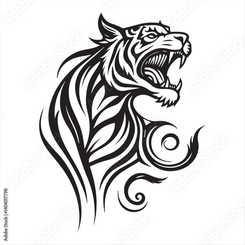 Fototapeta premium Tribal Tiger Head Vector – Black and White Roaring Tiger Tattoo Design