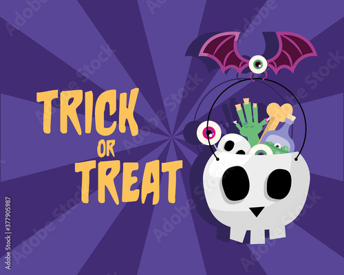 Fototapeta premium Trick or treat hand bone and poison inside skull head vector design