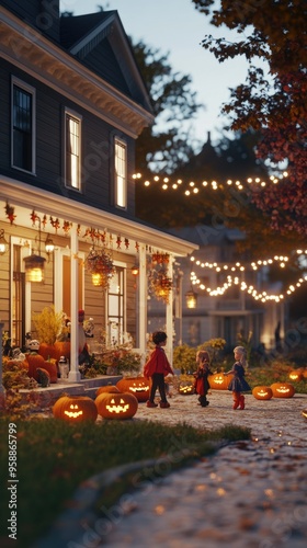 Naklejka premium Trick-or-Treat Street with Kids in Costumes and Houses Decorated for a Spooky Halloween Night