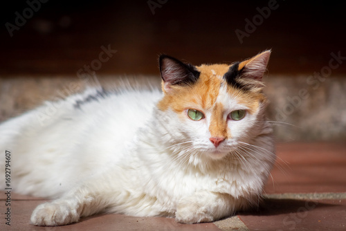 © ric, Obraz premium Tricolor cat with green eyes lying on the floor.