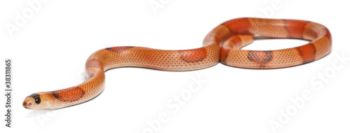 © Eric Isselée, Fototapeta premium Tricolor hypomelanistic Honduran milk snake, in front of white