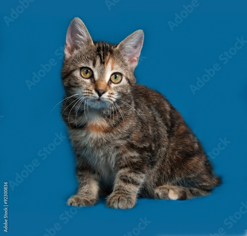 © Hanna Darzy, Obraz premium Tricolor kitten sitting on blue