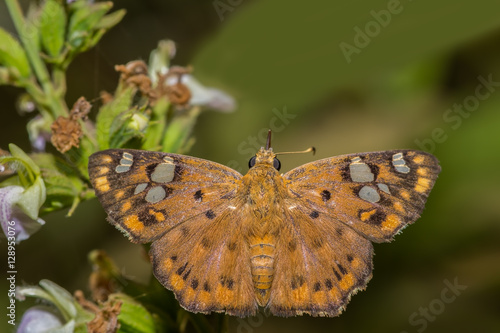 © sanjayd101, Obraz premium tricolor pied flat butterfly with its wings open, perched on a wild flower