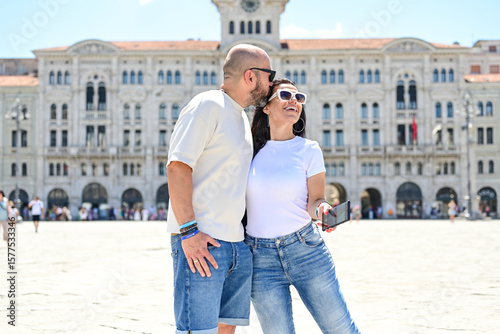 Obraz premium Trieste ,Italy, Piazza Unita` .Happy smiling couple of tourists making...