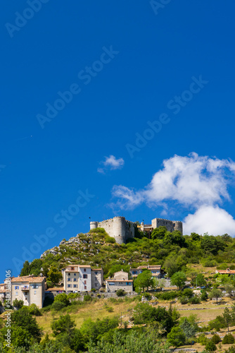 Obraz premium Trigance castle overlooking the village in Provence, France, under blue...