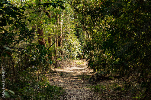 © Marcos, Fototapeta premium Trilha de folhas na mata com arvores
