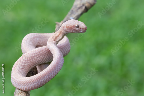 © kuritafsheen, Fototapeta premium Trimeresurus purpureomaculatus on branch, Mangrove pit viper with defensive position on branch, Indonesian viper snake