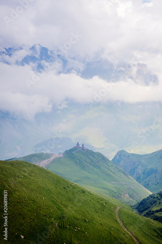© dinozzaver, Fototapeta premium Trinity church in Kazbegi, Georgia