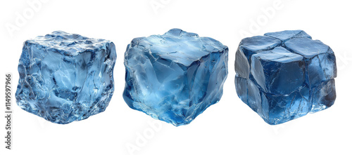 © Yhs City, Naklejka premium Trio of blue ice cubes with detailed texture, isolated on transparent background. PNG file