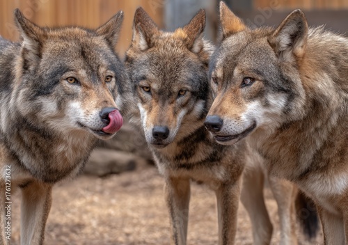 Fototapeta premium Trio of gray wolves standing together, displaying pack behavior and mutual...