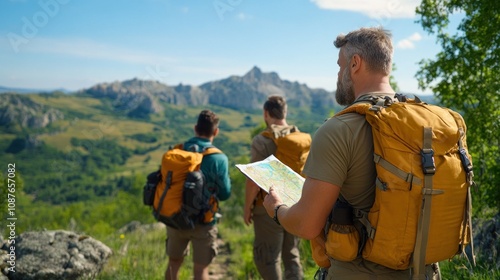 © Anna, Naklejka premium trio of hikers with backpacks studies a map on a trail in a mountainous area, enjoying the stunning views and preparing for their adventure in nature