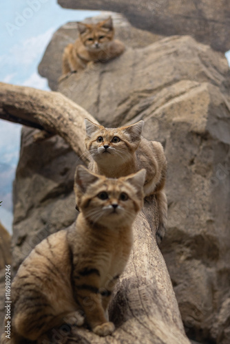 © Erika, Naklejka premium Trio of Sand Cats Perched on a Branch and Rocks in a Desert-Themed Habitat