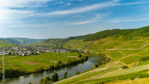 Fototapeta premium Trittenheim, Moselle Valley with loop of river, aerial view, riesling wine...