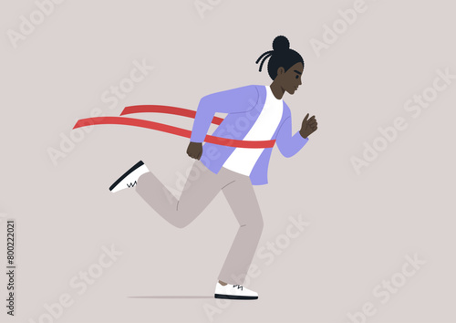 © nadia_snopek, Obraz premium Triumphant Sprint to Victory, A determined runner breaks through the red finish ribbon