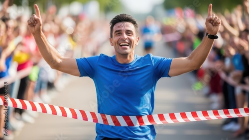 © photoplotnikov, Fototapeta premium Triumphant young male runner crossing finish line with joyous expression