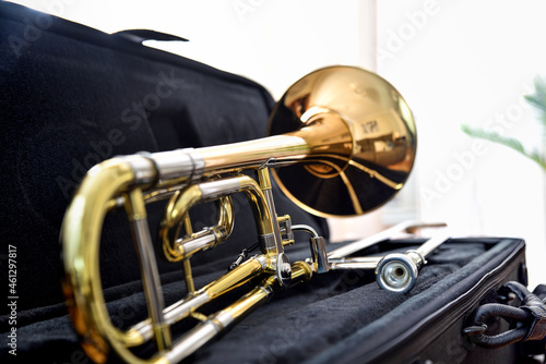 © Davizro Photography, Obraz premium Trombone detail with transposer mounted and supported on suitcase front