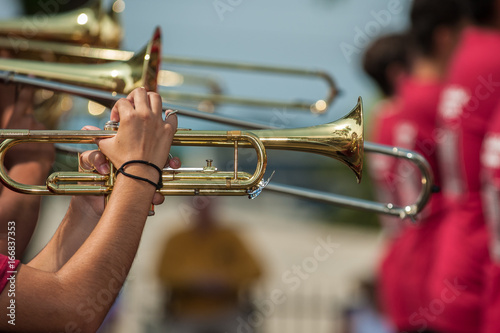 © motionshooter, Obraz premium Trombone players with hands on the main slide for the marching band.