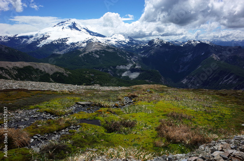 Naklejka premium Tronador Extinct stratovolcano snow topped mountain in southern Andes, View from Nahuel Huapi national park in Argentina Patagonia, Nature background South America green grass meadow