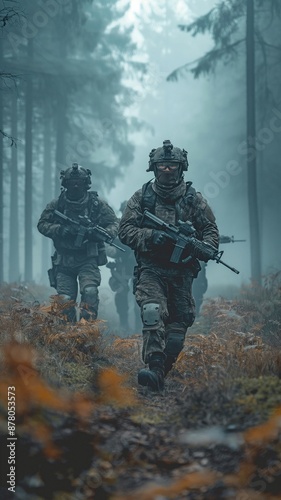 Fototapeta premium Troops from the military force going carefully through a forest in a commando formation