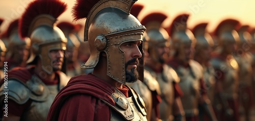 © Viktor, Fototapeta premium Troops of roman legionnaires stand armored ready for fight. Group of ancient soldiers with helmets, red cape prepare for war. Bearded legionary portrait. Historical roman empire army on battlefield.