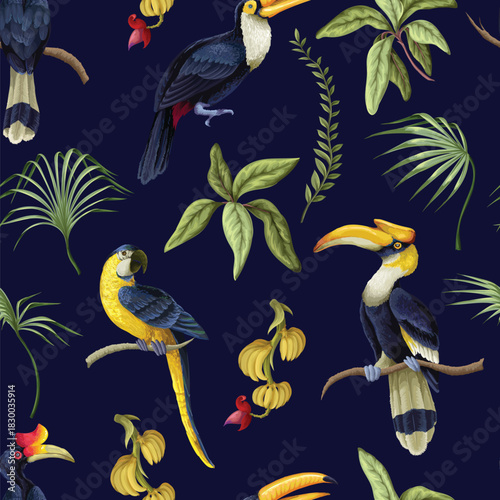 © Yumeee, Obraz premium Tropic jungle birds vector seamless pattern with exotic parrots toucans leaves and branches
