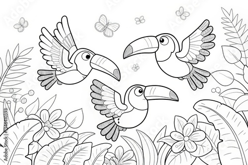 © Jenjira, Fototapeta premium Tropical animal theme, Three cartoon toucans flying among tropical foliage and butterflies, in a coloring book style. Outline for coloring