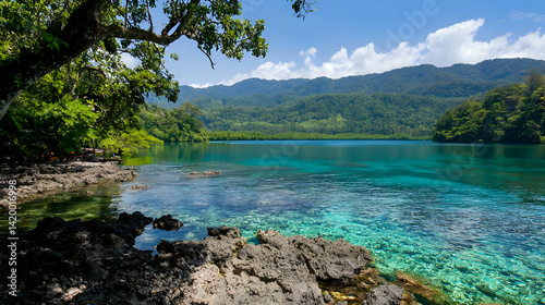 Obraz premium Tropical Bay Scene With Turquoise Water And Lush Vegetation