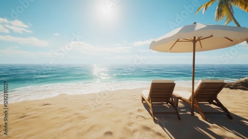 Obraz premium Tropical beach chairs under umbrella, ocean view, sunny day, vacation relaxation