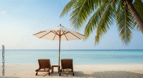 © Aekion, Obraz premium Tropical Beach Escape: Relax Under Palms, Sun, & Azure Waters. Paradise Found!
