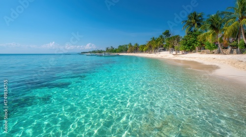 Fototapeta premium Tropical beach featuring clear turquoise water, white sand, palm trees, and bright sunny sky, creating a vibrant, relaxing atmosphere.