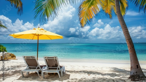 © Ariep, Obraz premium Tropical Beach Getaway with Yellow Umbrella