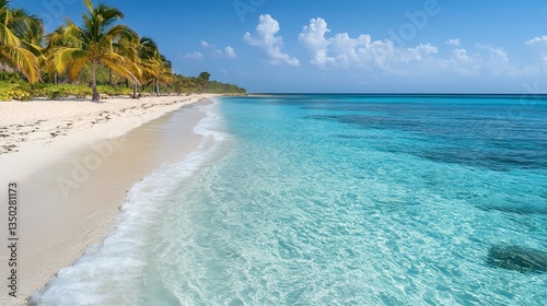Obraz premium Tropical beach Palms line sandy shore. Crystal ocean meets blue skies background