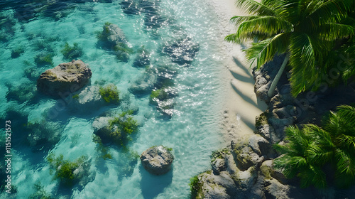 Fototapeta premium Tropical Beach Paradise: An Aerial View of Crystal Clear Waters, Palm Trees, and Sandy Shores