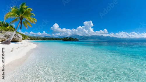 © BROPRADANA, Fototapeta premium Tropical beach paradise Palm tree, white sand, turquoise water, island background, vacation travel