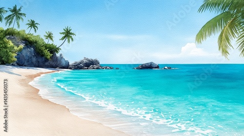 Fototapeta premium Tropical Beach Paradise - Serene tropical beach scene with turquoise water, white sand, palm trees, and rocky shoreline. Perfect for travel, vacation, or summer themes