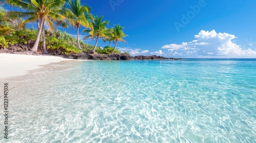 Naklejka premium Tropical beach paradise white sand, palm trees, turquoise water, clear sky; ideal for travel brochures