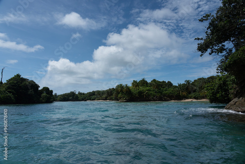 © GERMANALBERTO, Obraz premium Tropical Beach Paradise with Clear Water, Palm Trees, and Blue Sky - A Serene, Unspoiled Island Destination Offering Eco-Tourism and Adventure Travel in a Beautiful, Scenic Caribbean Setting