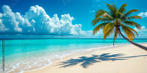 Obraz premium Tropical beach paradise with palm tree, blue sky, white sand, and turquoise...