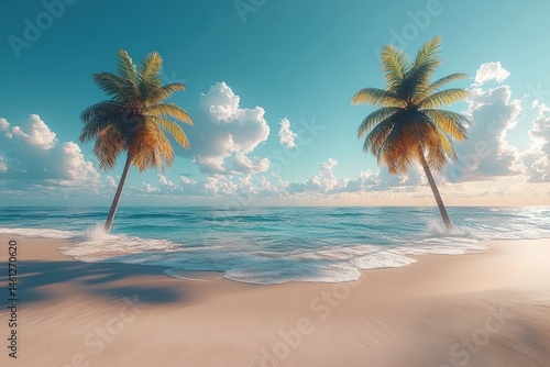 © Oleksandr, Obraz premium Tropical beach paradise with palm trees and gentle waves at sunset