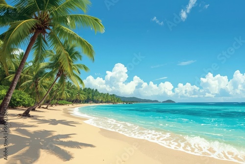 Fototapeta premium Tropical Beach Paradise with Palm Trees and Ocean Waves: Scenic Summer Vacation Destination for Relaxation and Serenity