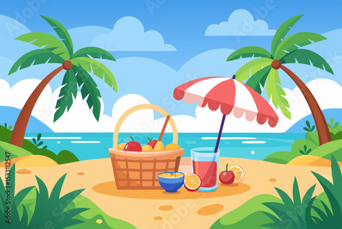 © Rakin, Obraz premium Tropical beach paradise with sun, palm trees, and the ocean's calm waves