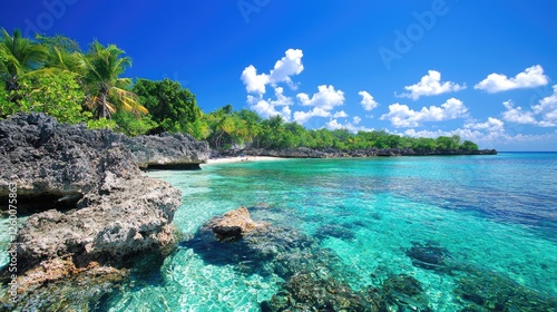 Obraz premium Tropical beach paradise with turquoise water, lush vegetation, and clear sky. Possible use Stock photo for travel advertisements, tourism brochures