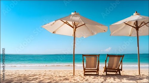 Fototapeta premium Tropical Beach Relaxation Two Deckchairs Under Umbrellas Serene Vacation Lifestyle Stock Photo Image