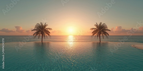 Fototapeta premium Tropical beach resort at sunset, with vibrant sky and relaxing atmosphere for...