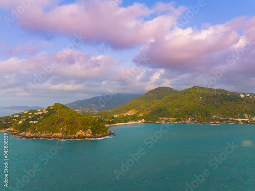 Fototapeta premium Tropical Beach. Sandy beach with palm and turquoise sea. Summer vacation and tropical beach concept.