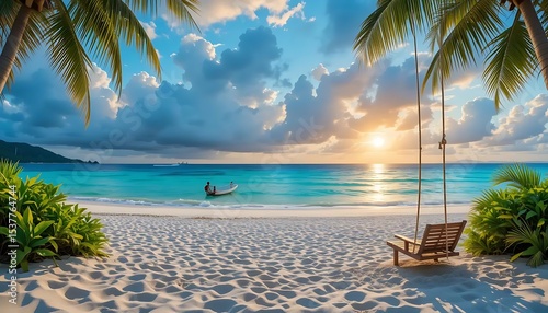 © Morits Art, Obraz premium Tropical Beach Scene at Sunset with Swing and Boat on Water
