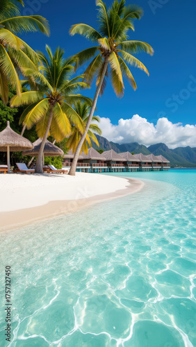Naklejka premium Tropical beach scene featuring palm trees, clear turquoise water, and serene...